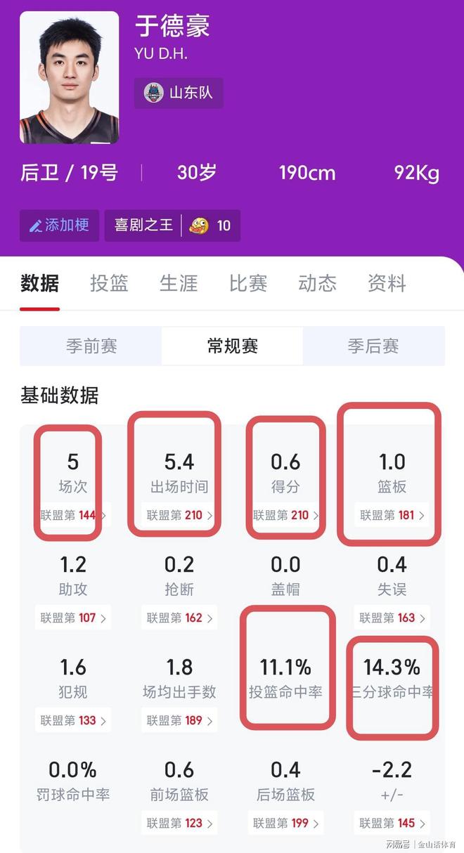 “沒有不景氣,只有不爭氣。”,記不清這是哪位大神說的話。如今,在CBA聯賽中,有這樣一位球員,他曾經是“國字號”后衛,以鐵血防守著稱,在CBA聯賽中頗有名氣。然而,正值當打之年的他,如今個人競技狀態卻斷崖式下滑,本賽季場均僅為0.6分。其場上糟糕表現,讓人大跌眼鏡。沒錯,他就是效力山東男籃的后衛-于德豪。