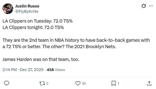 同時快船連續兩場真實命中率高達72%+成為歷史第二支做到這一點的球隊,第一支是2021年的籃網,巧合的是當時哈登正效力于籃網。