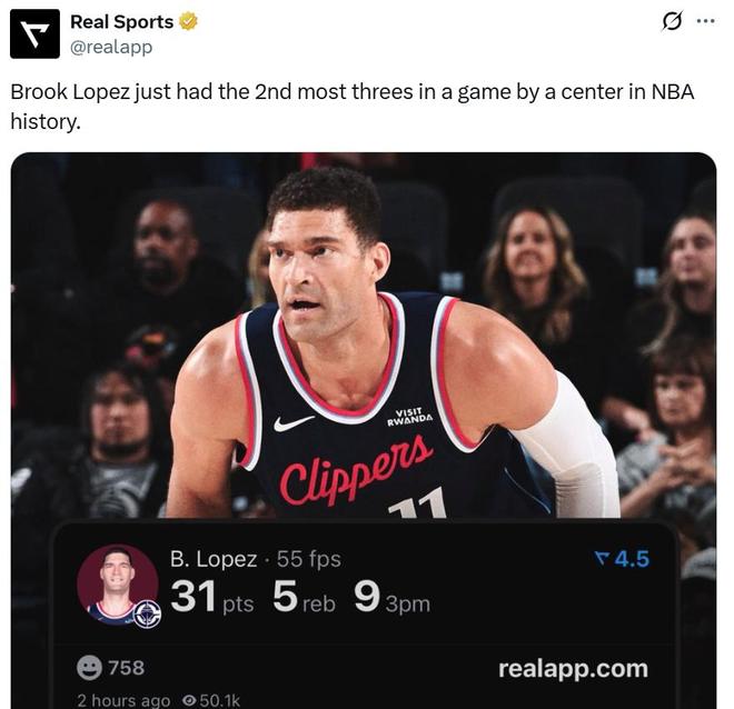 憑借這樣的表現,大洛刷新個人單場三分命中數紀錄的同時,也創造NBA歷史中鋒第二多,僅次于唐斯(10記)。
