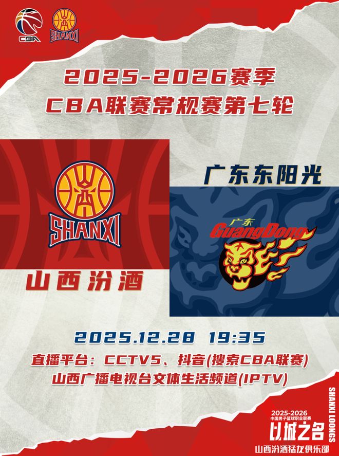 北京時(shí)間2025年12月28日19:35,2025-2026賽季CBA聯(lián)賽常規(guī)賽第七輪繼續(xù)進(jìn)行,山西汾酒坐鎮(zhèn)主場(chǎng),迎戰(zhàn)廣東東陽(yáng)光,球迷觀眾可以通過(guò)CCTV5、央視頻、抖音(搜索CBA聯(lián)賽)、山西廣播電視臺(tái)文體生活頻道(IPTV)觀看比賽實(shí)況,敬請(qǐng)期待!