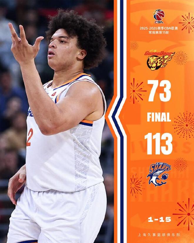 上海外援洛夫頓僅出場16分26秒,14中10帶傷高效轟下26+6+5,引領上海113-73狂勝廣東創造隊史交鋒最大贏球分差紀錄。