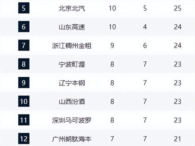 積分榜前三名依舊由廣廈、上海和廣東三隊把持。衛(wèi)冕冠軍廣廈隊憑借一波4連勝,以13勝2負的戰(zhàn)績獨占鰲頭,領先廣東隊1個勝場。上海隊以12勝3負的戰(zhàn)績緊隨其后,位列第2名。廣東隊則在上一輪40分慘敗給上海隊后,戰(zhàn)績同為12勝3負,但因交鋒戰(zhàn)績劣勢暫居第3名。