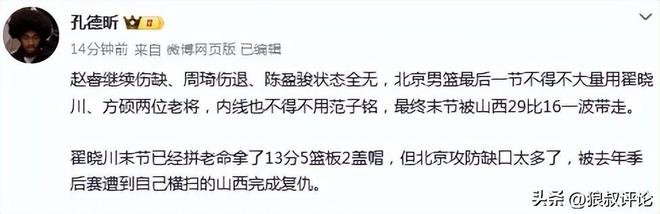 翟曉川末節已經拼老命拿了13分5籃板2蓋帽,但北京攻防缺口太多了,被去年季后賽遭到自己橫掃的山西完成復仇。