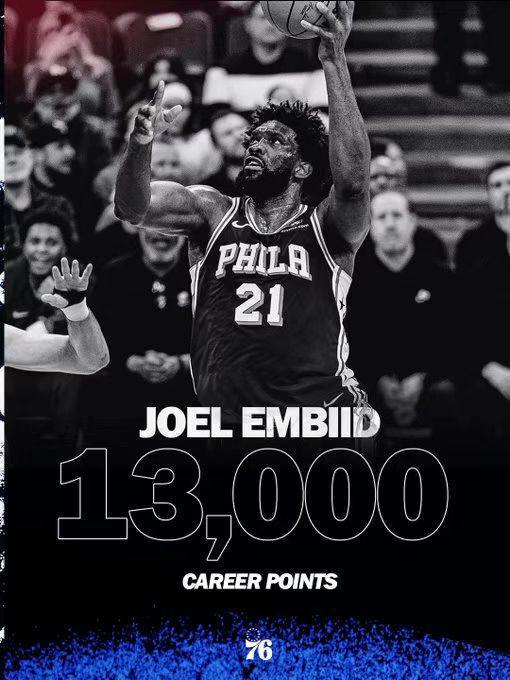 恩比德達成生涯常規賽13000分里程碑,他成為76人隊史以76人球員身份第7位達成該成就的球員。