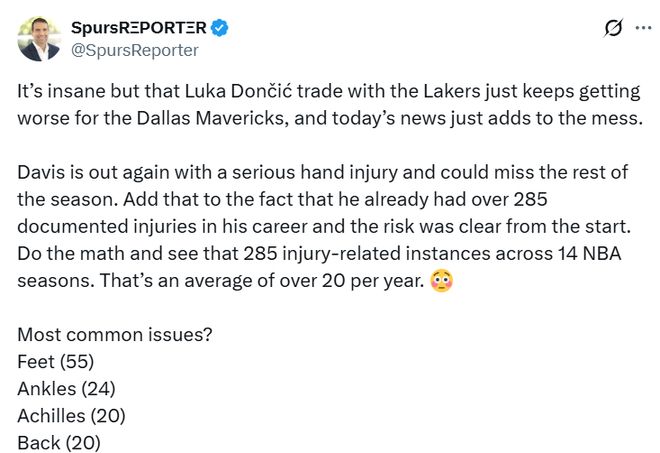 Garza表示:“戴維斯再度因左手嚴重傷勢缺陣……他職業生涯中被記錄在案的傷病已經超過285次,這筆交易的風險從一開始就顯而易見。簡單算筆賬就知道,14個NBA賽季里出現285次傷病相關情況,平均每年超過20次。他最常見的傷病部位有哪些?腳部55次,腳踝24次,跟腱20次,背部20次。”