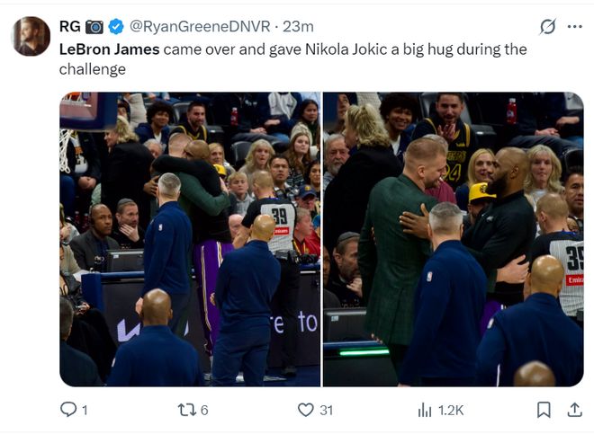 比賽結束后約基奇與詹姆斯也緊緊相擁,約基奇祝賀老詹拿到勝利,老詹祝賀約基奇入選全明星先發,超巨都是惺惺相惜。