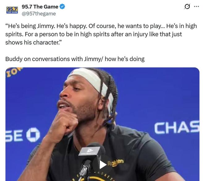 賽后談及巴特勒受傷后的狀態,希爾德說道:“他還是那個吉米,心情依舊不錯,當然,他非常渴望登場比賽,但他的精神狀態沒問題,一個人在經歷如此大傷時還能保持這樣的精神,這正體現了他的性格。”