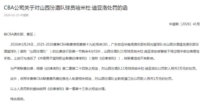 CBA公司關于對山西汾酒隊球員迪亞洛處罰的函