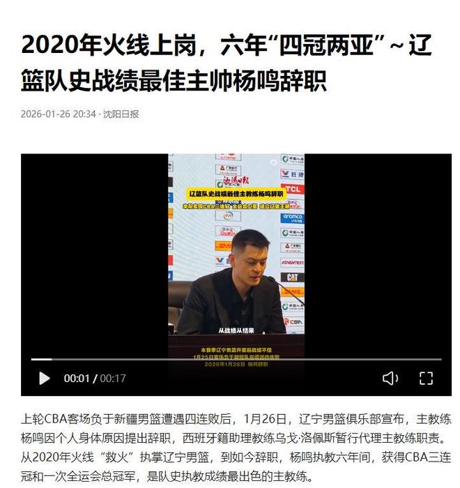 1月26日,遼寧男籃俱樂部官宣楊鳴由于身體原因辭去了主教練一職。