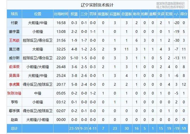 本場比賽最引人注目的數(shù)據(jù)出現(xiàn)在第四節(jié),遼寧隊在這一節(jié)全隊僅得到4分,根據(jù)賽后統(tǒng)計,這是遼寧隊史的單節(jié)最低得分,全場比賽,遼寧隊運動戰(zhàn)命中率不足35%,罰球線上11次出手僅命中4球。