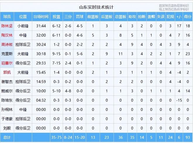 他們在助攻數上以35比13遙遙領先,全隊五人得分上雙。外援克里斯得到23分和11個籃板,并送出4次搶斷,陳林堅命中4記三分球,貢獻18分,陶漢林得到16分和8個籃板,高詩巖雖然只得到4分,但送出了9次助攻。