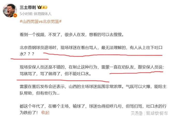 然而,就在山西隊輸球之后,山西隊球迷又鬧事了。在北京隊離開之際,山西隊球迷不僅辱罵了北京隊球員,而且,他們竟然還朝著北京隊球員吐口水。陳盈俊、雷蒙等人在隨后便向現場安??棺h,雷蒙在隨后的言語,甚至讓人有些心疼。“罵就罵吧,罵了就得了,但不能吐口水。”雷蒙如此說道。很顯然,從現場的局面上來看,山西隊雖然加強了安保,可依然未能阻擋山西隊球迷的“熱情”。