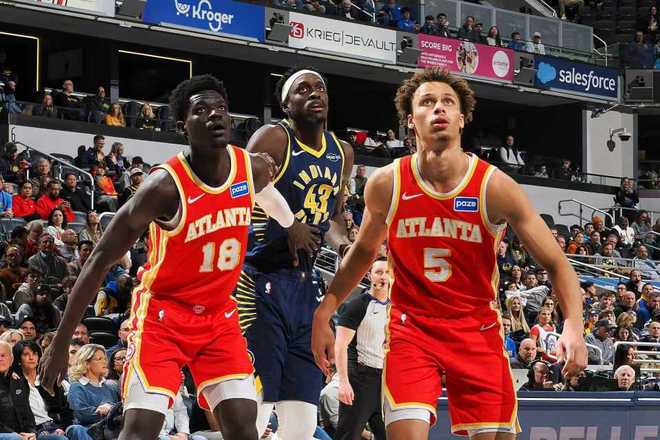 老鷹上一場主場86-104輸給火箭,步行者上一場主場113-110險勝公牛,本賽季前兩次交鋒老鷹均戰勝步行者。本場老鷹缺少克雷伊奇、奧孔古、波爾津吉斯,步行者缺少托平與哈利伯頓。首節雙方早早開啟對攻模式,雙方持續緊咬比分纏斗至老鷹16-15領先,老鷹連得4分取得領先。老鷹之后繼續維持27-22領先,步行者反撲追到差1分,老鷹多點開花擴大39-33領先,麥康納中投得分,首節結束老鷹39-35領先步行者。首節老鷹28中15,其中三分4中2,杰倫10+2+3;步行者22中13,其中三分11中5,內姆哈德8中5命中3記三分得到15分。