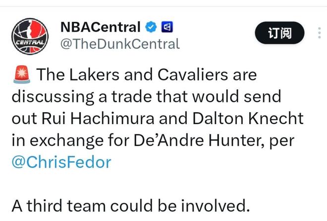 費多爾表示:“據我得到的消息,騎士與湖人已就德安德烈-亨特的交易搭建初步框架,交易主體為八村壘和道爾頓-克內克特,同時雙方還計劃引入第三方球隊參與交易。”