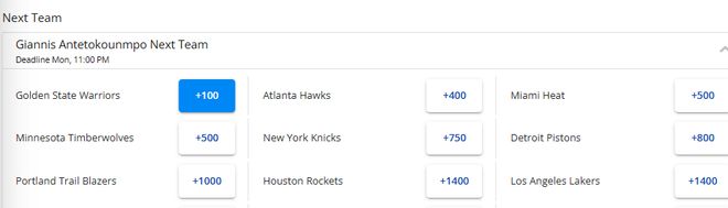 字母哥最新的賠率如下:1.勇士(+100)、2.老鷹(+400)、3.熱火、森林狼(+500)、5.尼克斯(+750)、6.活塞(+800)、7.開拓者(+1000)、8.火箭、湖人(+1400)。