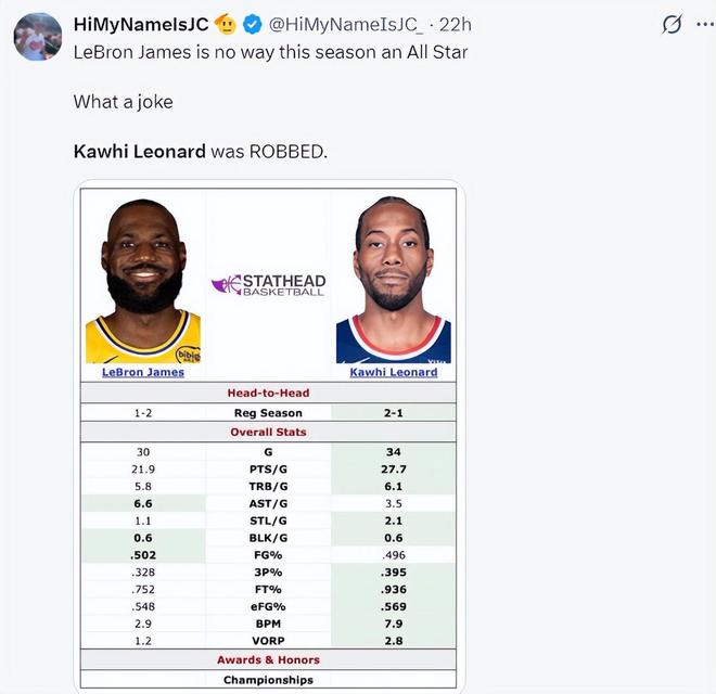 快船媒體曬出詹姆斯、倫納德的數(shù)據(jù)對(duì)比,倫納德還比詹姆斯多打4場(chǎng)比賽!