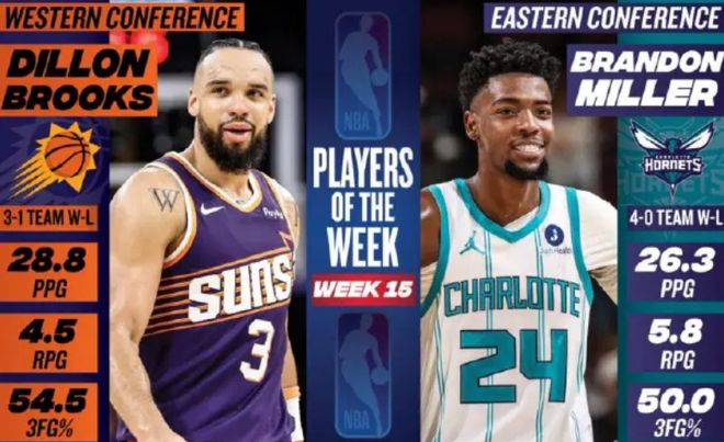 NBA官方公布了第15周的東西部周最佳球員,東部由黃蜂前鋒米勒當(dāng)選,西部由太陽后衛(wèi)狄龍當(dāng)選。米勒上周場均砍下26.3分+5.8籃板+2.3助攻,命中率高達(dá)50%,帶領(lǐng)黃蜂隊(duì)取得4勝0負(fù)的戰(zhàn)績。據(jù)統(tǒng)計(jì),這是米勒生涯首次拿到周最佳。狄龍上周場均貢獻(xiàn)28.8分+4.5籃板+2.8助攻,投籃命中率53.5%,三分命中率高達(dá)54.5%,帶領(lǐng)太陽隊(duì)取得3勝1負(fù)的戰(zhàn)績。據(jù)統(tǒng)計(jì),這也是狄龍生涯首次獲此殊榮。除此之外,騎士隊(duì)的阿倫、尼克斯隊(duì)的哈特、活塞隊(duì)的康寧漢姆、76人隊(duì)的恩比德、湖人隊(duì)的東契奇、火箭隊(duì)的杜蘭特、森林狼隊(duì)的華子、雷霆隊(duì)的亞歷山大和快船隊(duì)的小卡等球星獲得了周最佳提名。