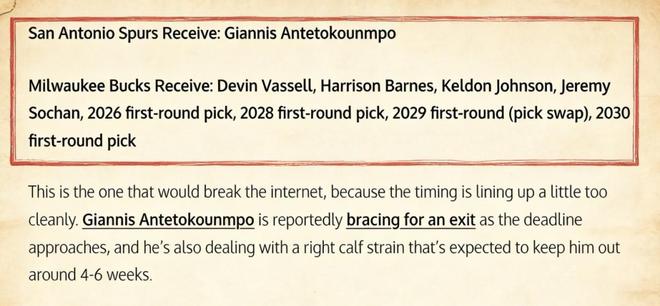以馬刺目前的陣容,想要和雷霆、掘金這樣的球隊競逐總冠軍,顯然還需要進一步補強。美媒《Fadeaway World》撰文提出了一套8換1的交易方案,建議馬刺加入雄鹿球星字母哥的爭奪戰,促成兩大歐洲巨星的聯手,即刻開啟爭冠。