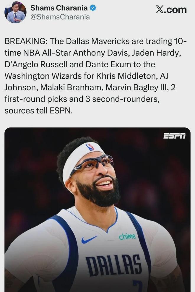 爆料王Shams:獨行俠將濃眉哥+拉塞爾+哈迪+埃克薩姆送至奇才,換回米德爾頓+AJ-約翰遜+布蘭納德+巴格利+2個首輪簽+3個次輪簽。