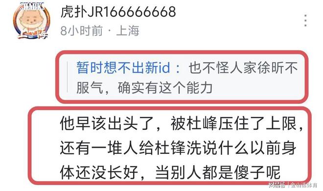 徐昕在“新東家”如魚得水的出色表現,也令眾人球迷(包括廣東球迷)喜出望外,贊揚聲一片“也不怪人家徐昕不服氣,確實有這個能力”;“離開杜鋒也是好起來了”;“徐昕:我在廣東四年了,還沒廣州三場快活”;“他早該出頭了,被杜峰壓住了上限,還有一堆人給杜鋒洗說什么以前身體還沒長好,當別人都是傻子呢”;“這么好的胚子在國產教練手上用了幾年 差點就廢了 為什么人米切爾能用好?”。