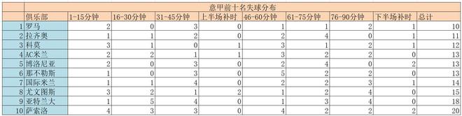 直到76-90分鐘,國米3個丟球,位列倒數第三,只比亞特蘭大和尤文圖斯好一些;拉齊奧和博洛尼亞都沒有丟球,并列第一;