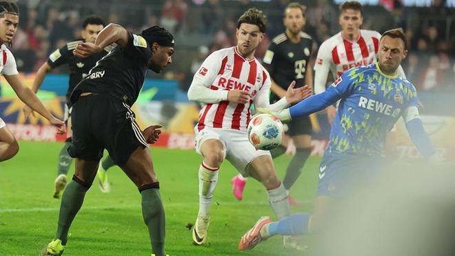 時隔兩個多月之后再次造訪萊茵能源球場,拜仁似乎并沒有完全吸取上一次的教訓,又一次首先失球。德國杯的時候是因為防守角球出現漏洞,被科隆中鋒阿赫在第31分鐘時首開紀錄。而這一回則是在第41分鐘時因連串個人失誤而失守:格納布里前場左肋斜塞被湯姆·克勞斯擋住,格納布里重新停球后一不留神就被邁納從側后方卡位搶斷。以速度見長的邁納立即帶球奔襲超過60米,而這一路若納唐·塔一直往后退退退,并未及時上前施壓,于是邁納最后得以在禁區弧內拔腿勁射。而最后一個出現失誤的是諾伊爾,面對邁納這腳時速達到106.75公里但角度很正的射門,他用雙掌一擋還是讓球撞入了網窩。