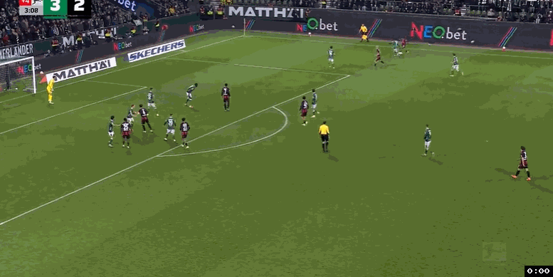 僅僅2分鐘后,不萊梅中后場左側斜長傳快速反擊,斯赫米德中路跟進突入禁區獲得單刀機會,稍微慢半拍的情況下,面對出擊的門將考阿,斯赫米德轉身往右邊做球,后排插上的米洛舍維奇迎球推射空門得手,不萊梅3:2反超了比分。從兩度領先到落后,法蘭克福沒有放棄,補時最后1分鐘,法蘭克福右路壓上,埃奇古亞卜強行突破下底,搶在皮球出底線之前將球兜回來,克瑙夫小禁區前沿搶點凌空推射,皮球直入球門右下死角,法蘭克福3:3壓哨絕平不萊梅。