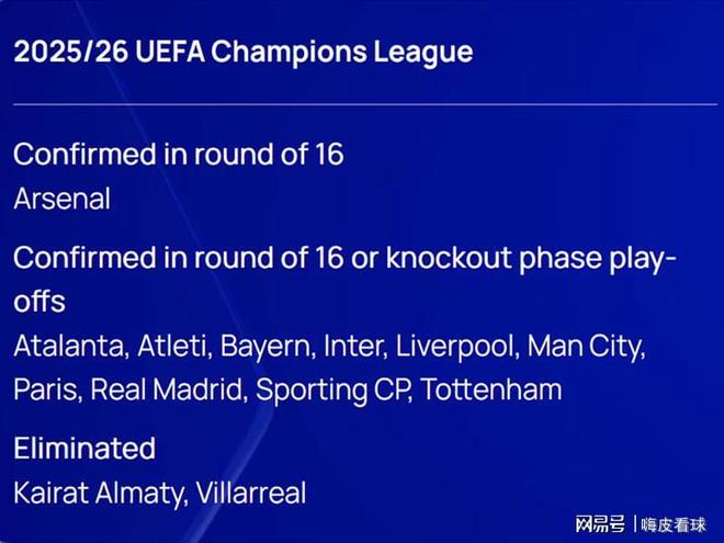 根據歐足聯官網發布的數據,提前晉級16強的,目前只有阿森納一支球隊,稍后開賽的拜仁慕尼黑和亞特蘭大,都有機會加入這個行列。7場只有1分,排名榜末的比利亞雷亞爾和阿拉木圖凱拉特,則提前一輪出局。