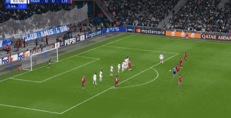 上半場傷停補時階段,利物浦獲得前場位置不錯的任意球,馬賽并沒有甚至臥倒的球員,索博斯洛伊巧射,打破僵局。