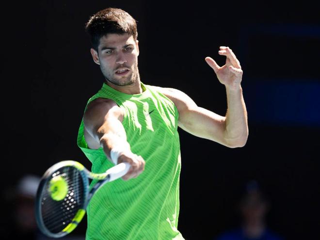 1月23日,阿爾卡拉斯在比賽中回球。新華社發(fā)(胡涇辰 攝)