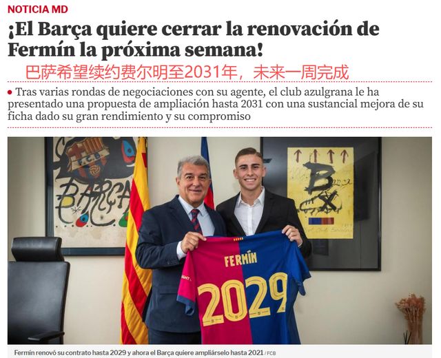 巴薩希望費爾明續約至2031年,成為全隊合同年限最長的球員之一(霍安-加西亞、亞馬爾、埃里克-加西亞、阿勞霍均是2031年),這體現俱樂部對費爾明的重視。