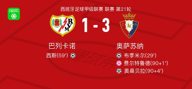 北京時間1月24日,西班牙足球甲級聯賽第21輪,巴列卡諾主場對陣奧薩蘇納。布季米爾率先破門,西斯隨后為巴列卡諾扳回一球。比賽臨近結束時,費爾特魯德不慎自擺烏龍,奧桑貝拉再入一球鎖定勝局。最終,巴列卡諾1比3不敵奧薩蘇納。