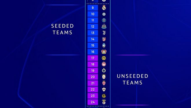 附加賽的對陣依據(jù)球隊在歐冠聯(lián)賽階段的最終排名來決定:
