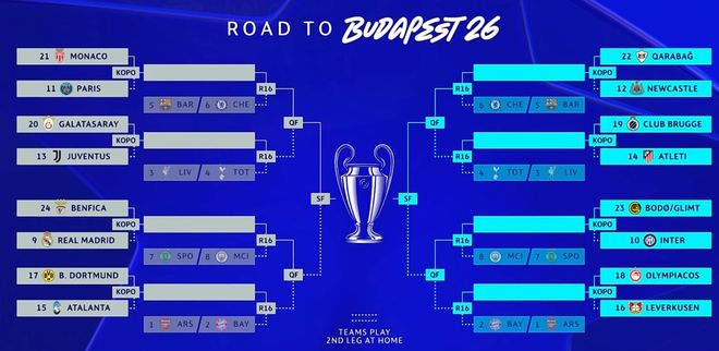 兩回合比賽的勝者將獲得進(jìn)入歐冠16強(qiáng)的資格。