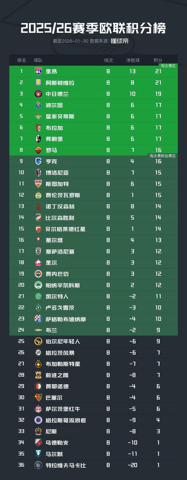 北京時間1月29日凌晨,2025/26賽季歐聯杯結束了聯賽階段的全部比賽,最終的晉級形勢全部得到確認。