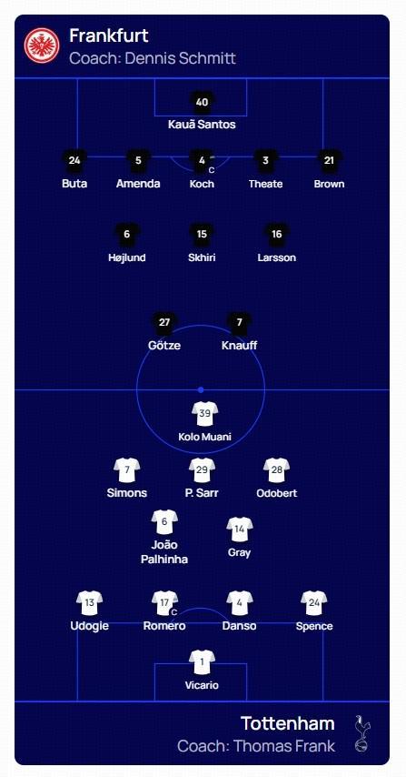 法蘭克福首發(fā):40-考阿-桑托斯、5-阿門達、4-科赫、3-阿蒂爾-蒂特、24-布塔、6-奧斯卡-霍伊倫、16-胡戈-拉松、21-納撒尼爾-布朗、15-斯希里、27-格策、7-克瑙夫