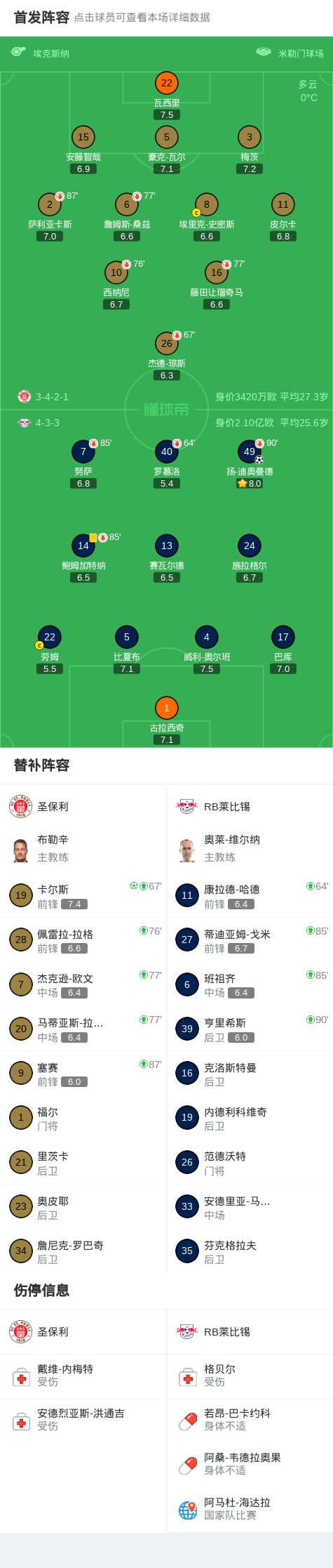 第66分鐘,迪奧曼德弧頂處起腳射門得分打破僵局,萊比錫1-0圣保利