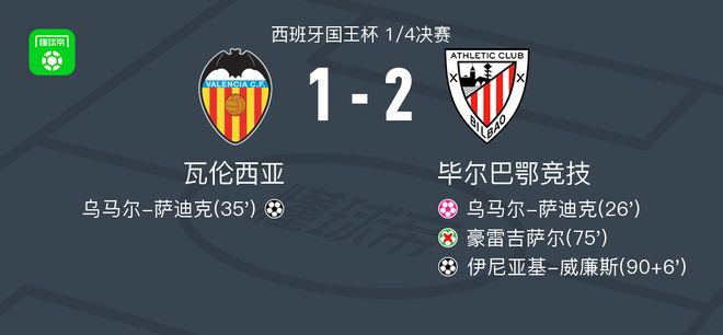 北京時間2月5日西班牙國王杯 1/4決賽,瓦倫西亞對陣畢爾巴鄂競技。瓦倫西亞烏馬爾-薩迪克破門,烏馬爾-薩迪克自擺烏龍。畢爾巴鄂競技伊尼亞基-威廉斯破門。最終比分瓦倫西亞 1-2 畢爾巴鄂競技。