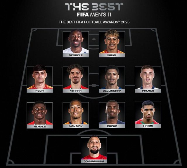 FIFA年度最佳陣容的442陣型,雙前鋒是亞馬爾、登貝萊,中場是佩德里、維蒂尼亞、貝林厄姆、帕爾默。論個人表現,拉菲尼亞取代貝林厄姆、帕爾默,完全沒問題。