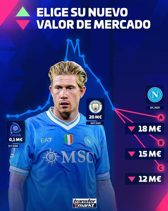 德轉將在12月23日更新意甲球員身價,此次預熱德布勞內的身價他們給出了三個選項,分別為下跌至1800萬歐元、下跌至1500萬歐元以及下跌至1200萬歐元。