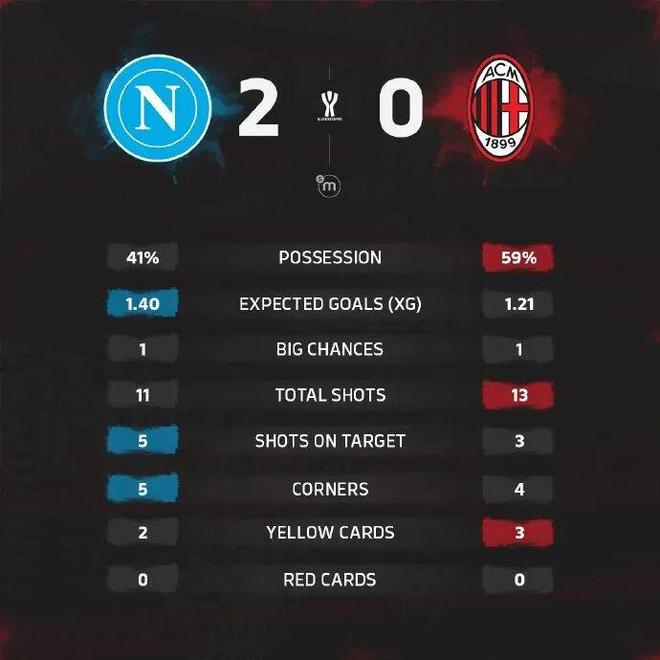 意大利超級杯半決賽,那不勒斯對陣米蘭,比賽在沙特國王大學(xué)體育場進(jìn)行。上半場,奇克、薩勒馬科爾斯造險,埃爾馬斯、恩昆庫失良機(jī),內(nèi)雷斯破門。易邊再戰(zhàn),霍伊倫小角度建功。最終米蘭0-2那不勒斯止步半決賽。