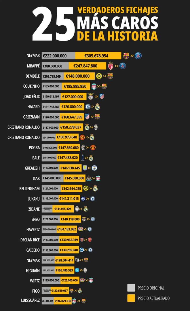 Betfair重新計算世界足壇歷史最貴的25筆交易: