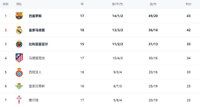 在積分榜上,巴薩依然占據榜首位置,14勝1平2負,拿到43分。皇馬贏球之后,戰績變成13勝3平2負,總積分達到42分,排名第2,只落后1分。不過,皇馬比巴薩多踢了1場。比利亞雷亞爾以35分排名第3。第4的是馬競,拿到了34分。西班牙人以30分排名第5。第6名的是皇家貝蒂斯,拿到25分。