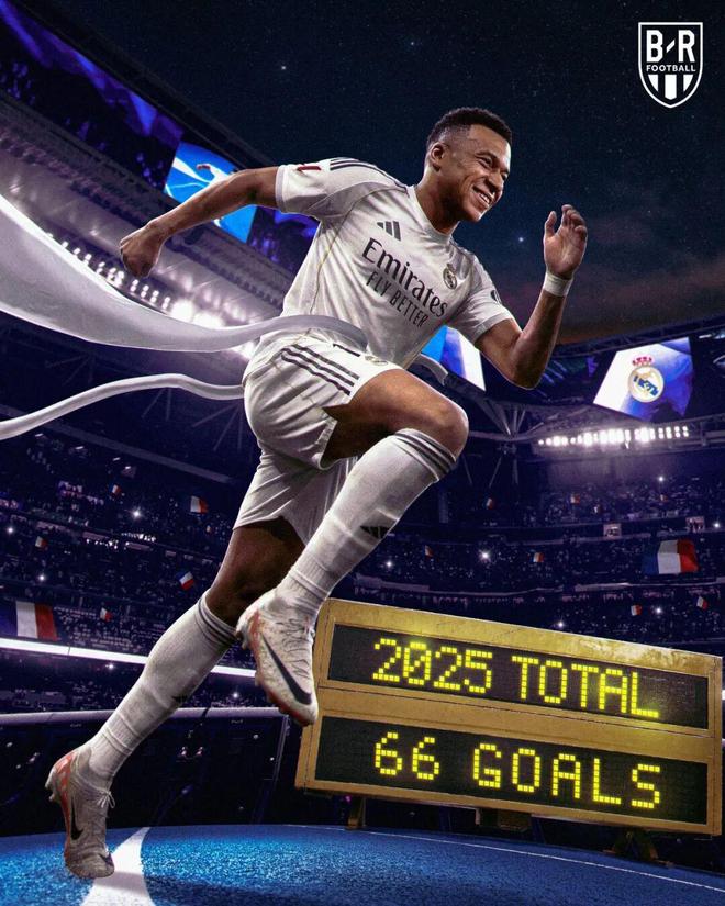 追平C羅的皇馬隊史單年度進球紀錄之余,姆巴佩也創造了個人年度進球新紀錄。2025年他在皇馬59場攻入59球,是職業生涯俱樂部新的年度進球紀錄。加上國家隊的7球,今年姆巴佩66場攻入66球,領先凱恩7球,哈蘭德9球。雖然兩人都有1場比賽才結束2025年,但要超越姆巴佩難度太大。