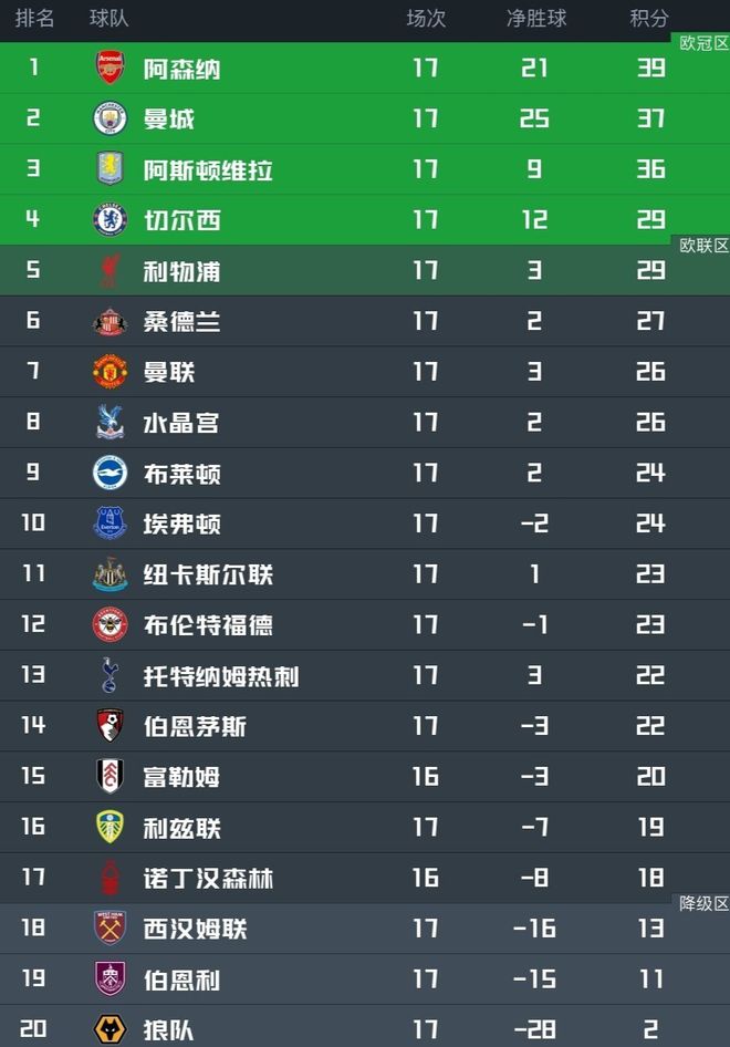 目前,英超積分榜上阿森納、曼城和維拉這3隊已經與其他球隊拉開分差,第3名的維拉已經領先第4名的切爾西多達7分。英超冠軍大概率將在這3隊中產生。而利物浦,盡管衛冕無望,但憑借本輪2-1擊敗熱刺的關鍵勝利,悄然升至第5位,沖擊歐冠席位希望重燃。